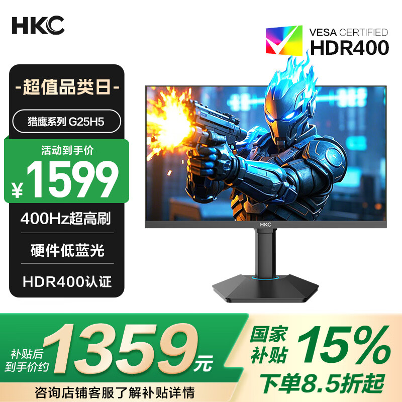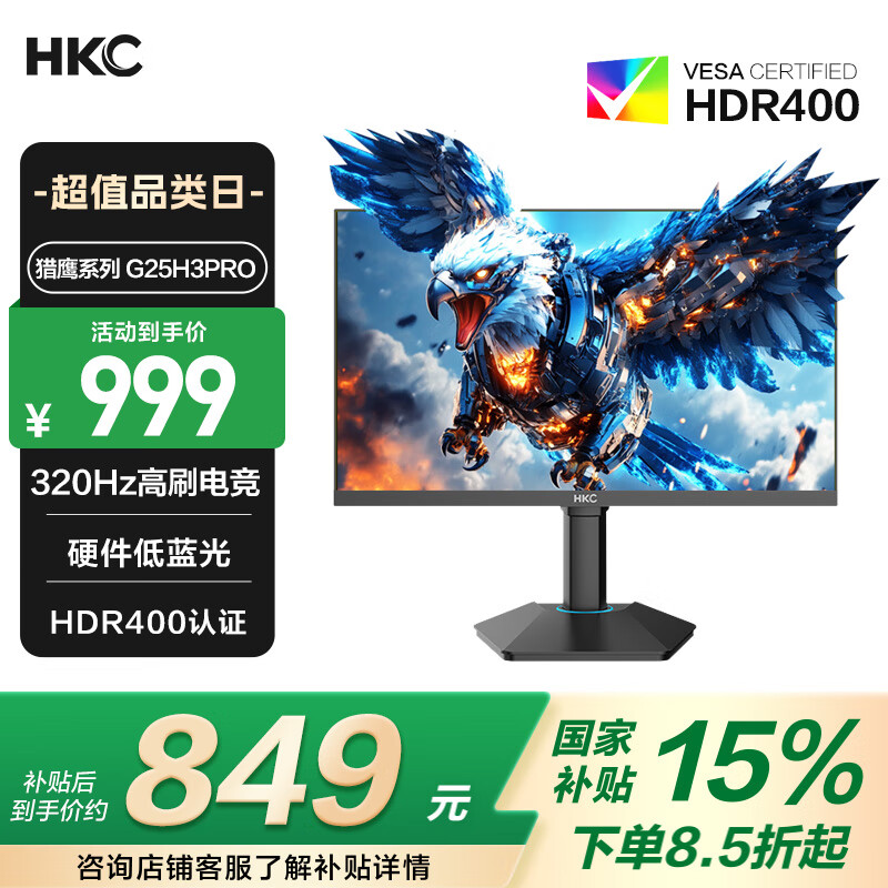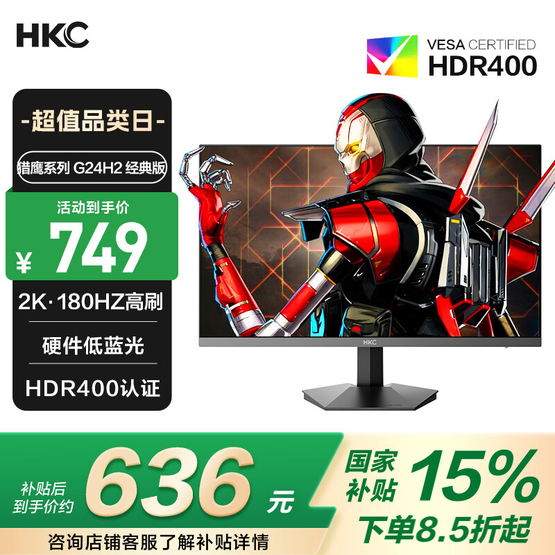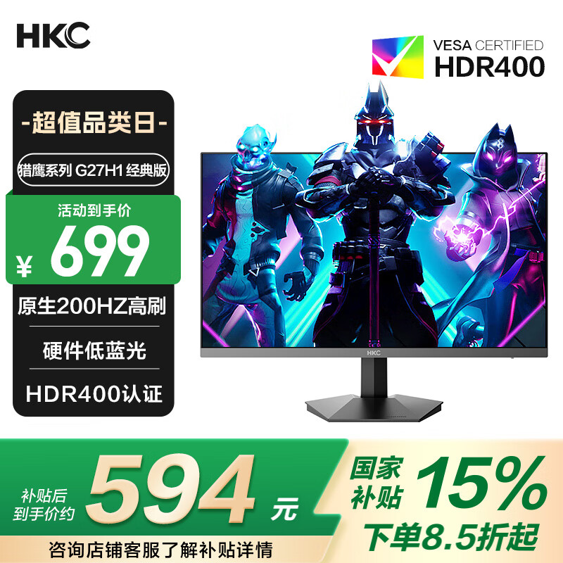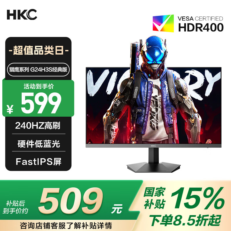 HKC 23.8英寸原生200Hz高刷FastIPS硬件低蓝光HDR400广色域1ms电竞PS5游戏显示器猎鹰 G24H1经典版