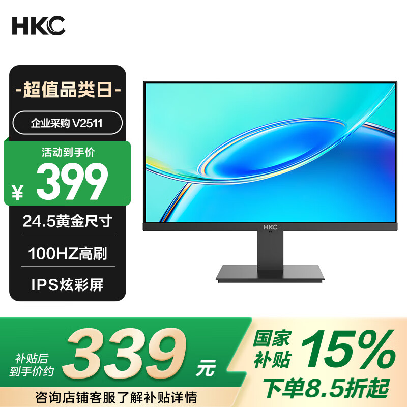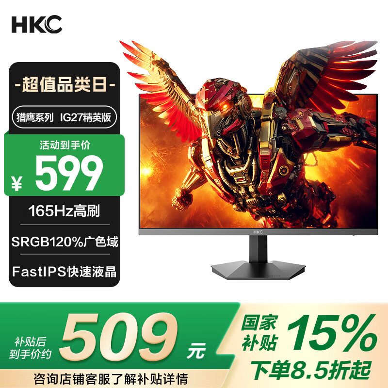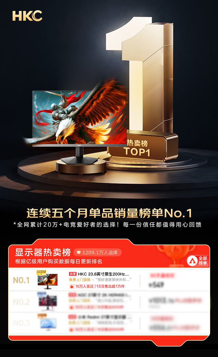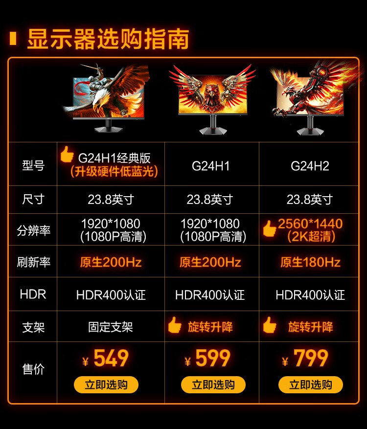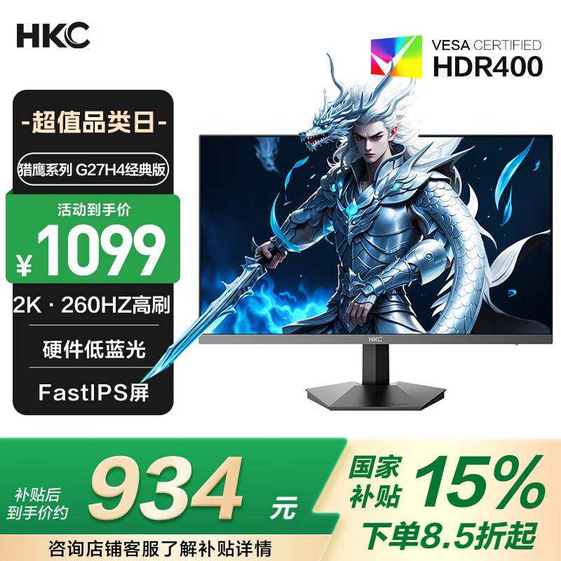 HKC 23.8英寸原生200Hz高刷FastIPS硬件低蓝光HDR400广色域1ms电竞PS5游戏显示器猎鹰 G24H1经典版